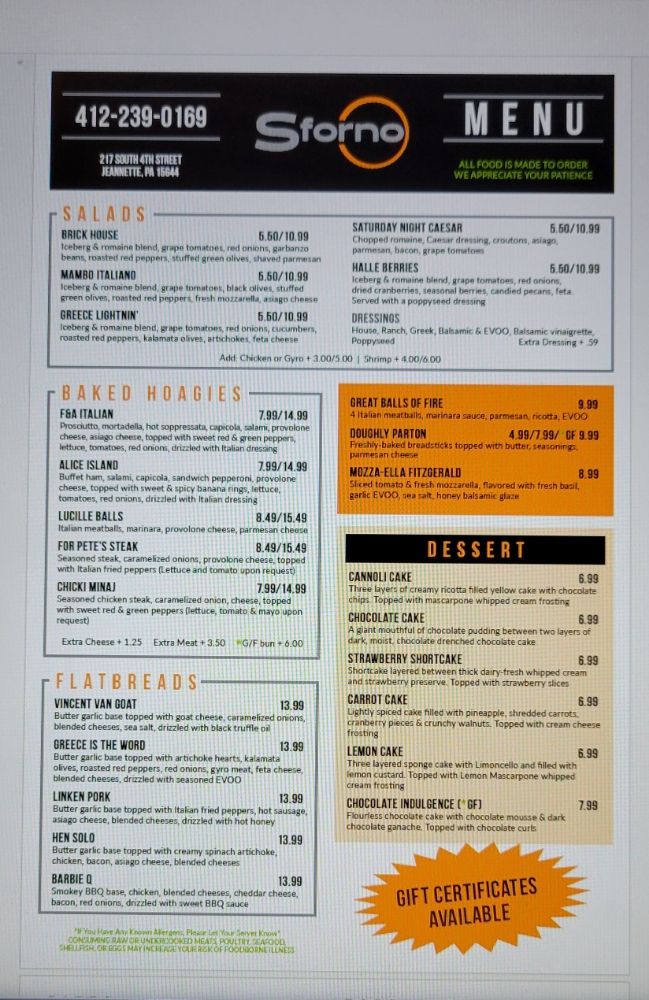 Introducing Sforno, a delightful eatery nestled at 217 S 4th St in Jeannette, PA, where Italian cuisine shines through an exciting menu of pizza and salads. This charming spot offers a welcoming atmosphere, perfect for both dining in and takeout. Sforno’s pizza is highly praised, with standout dishes like the “Spice Spice Baby” and classic pepperoni leaving diners raving about the fresh, flavorful ingredients and phenomenal dough.